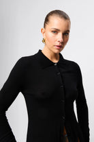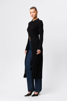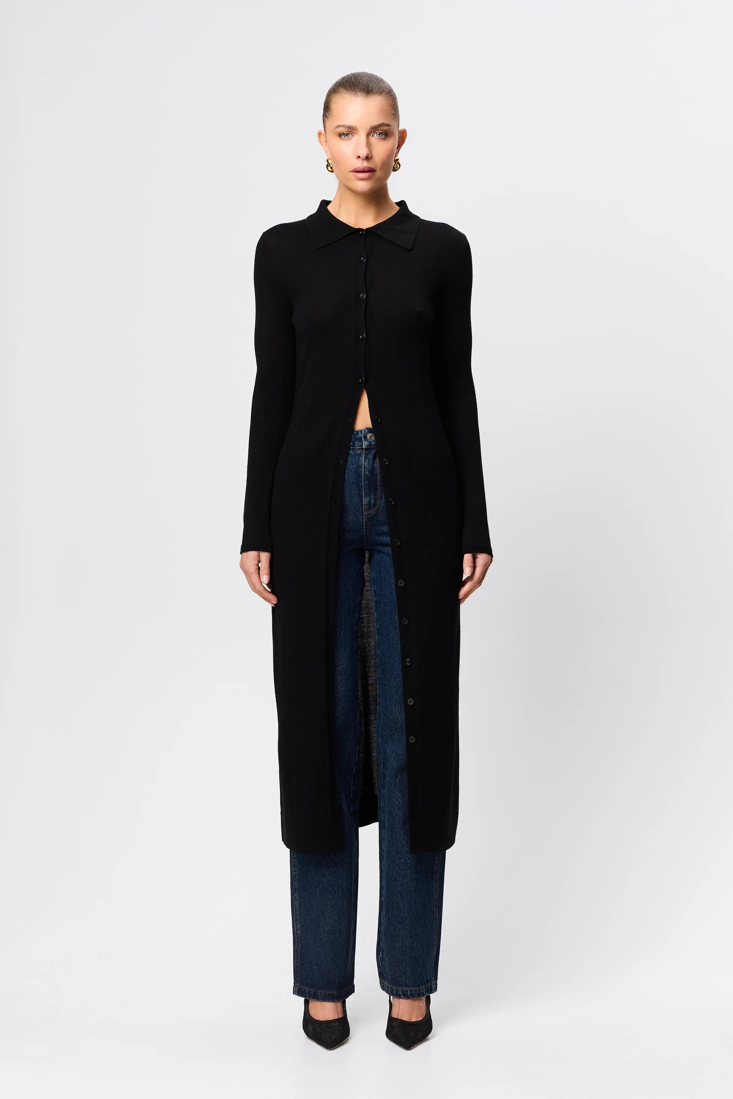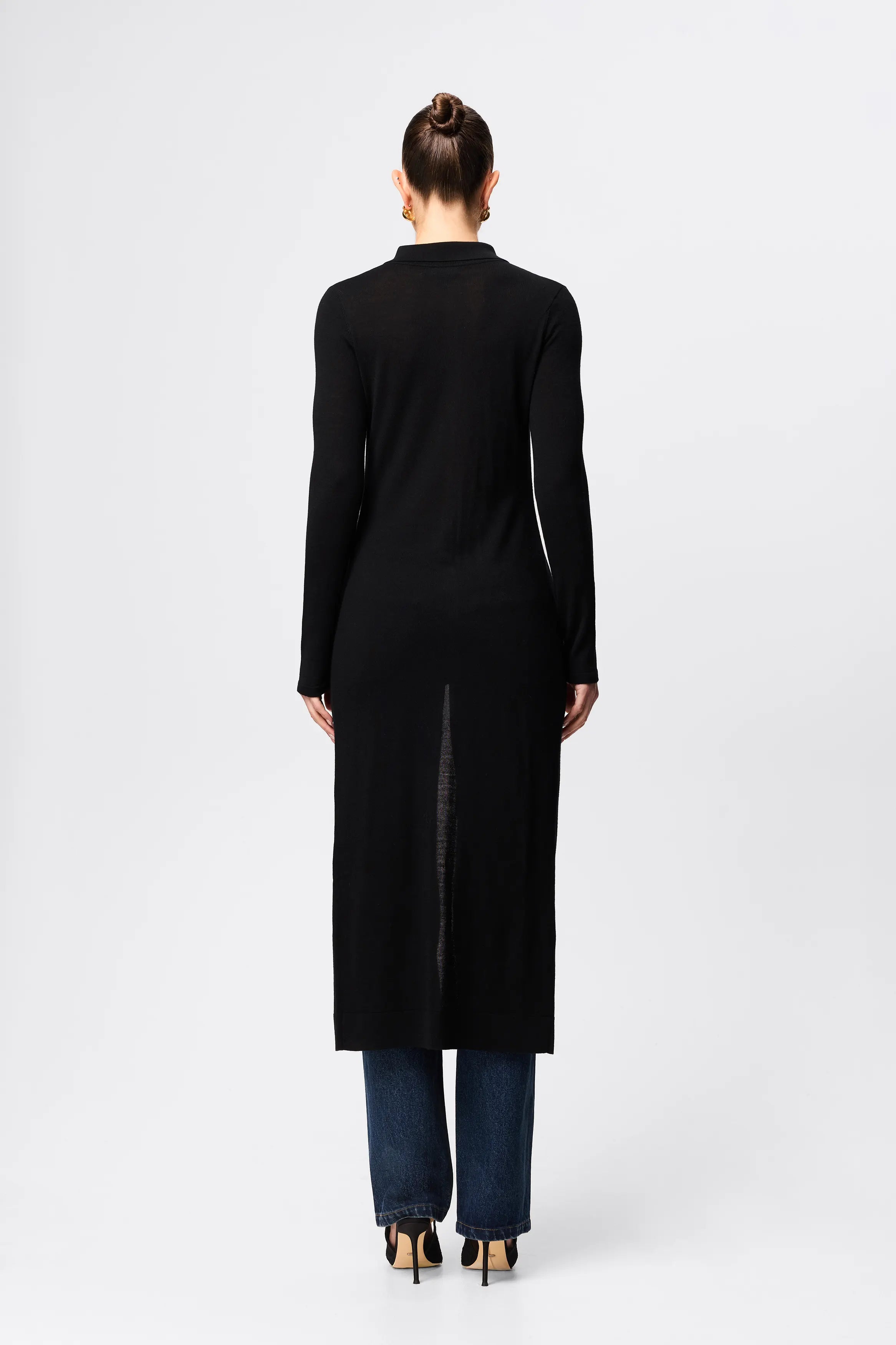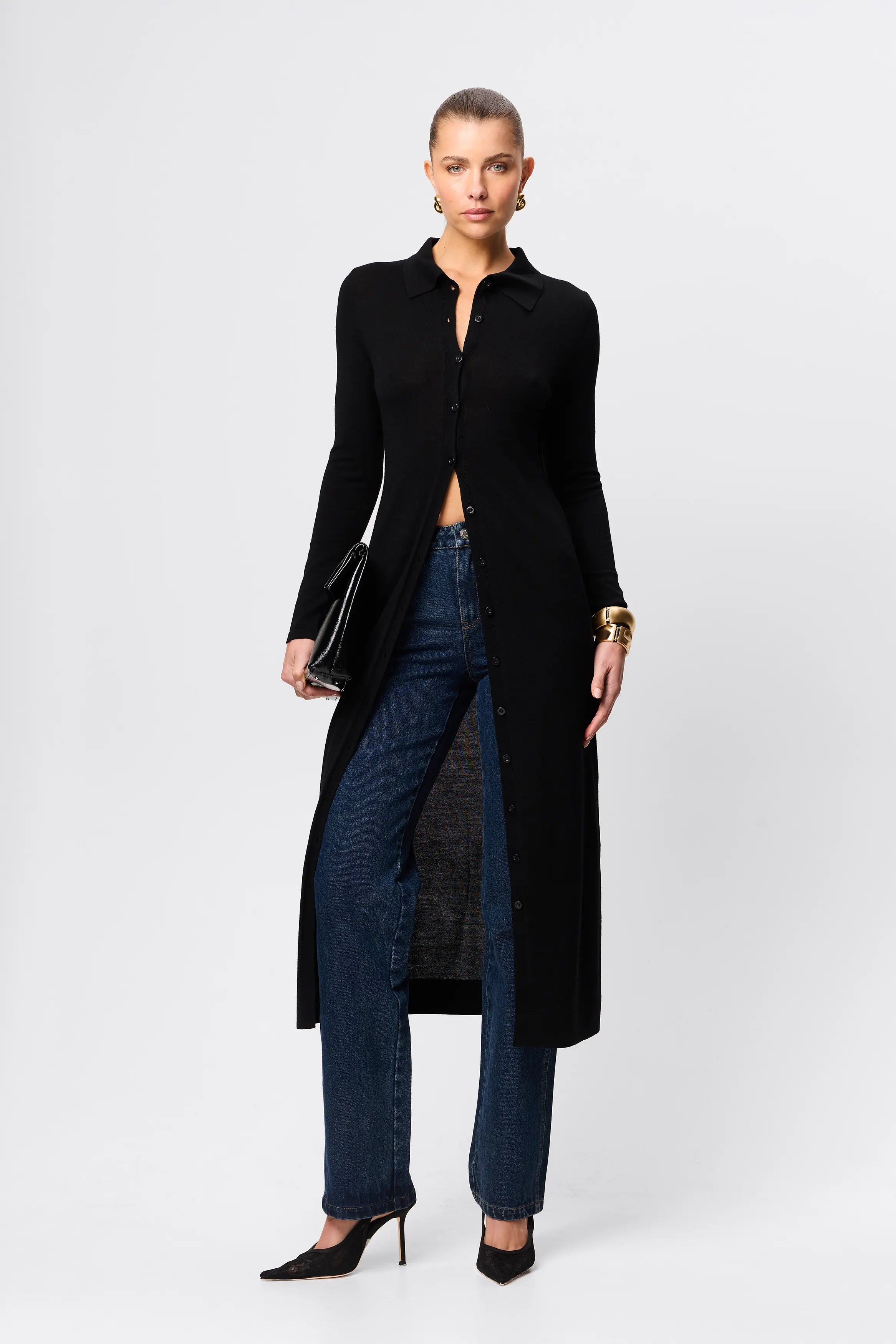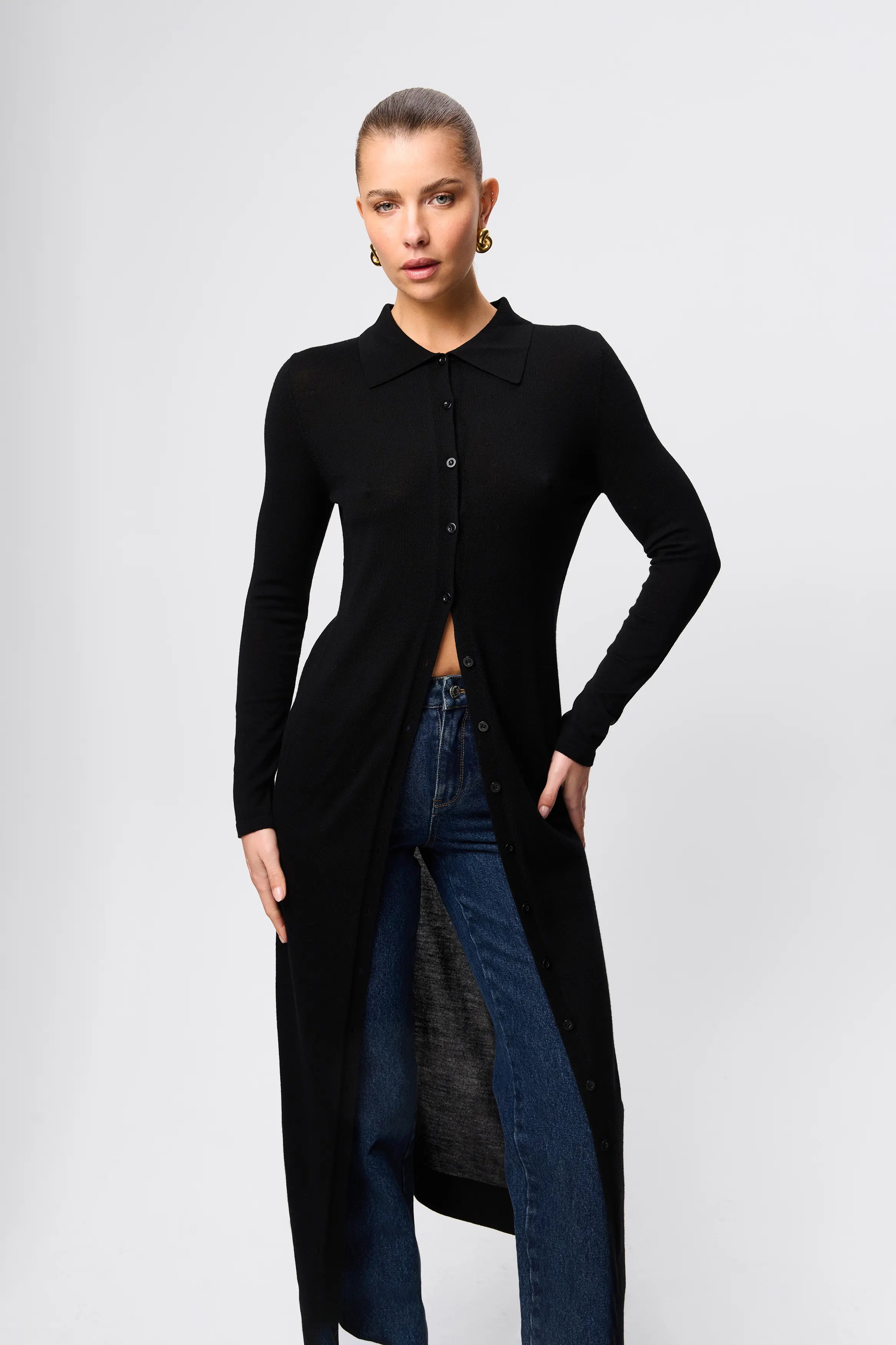 The Maine Longline Cardigan in Black is a versatile layering essential. Crafted from soft 100% merino wool, it features a collared neckline, a self-colored button front, and a fine-stitch texture for subtle movement. With a sleek longline silhouette, it offers breathable warmth and effortless style. Pair it with your wardrobe staples for a polished yet relaxed look.