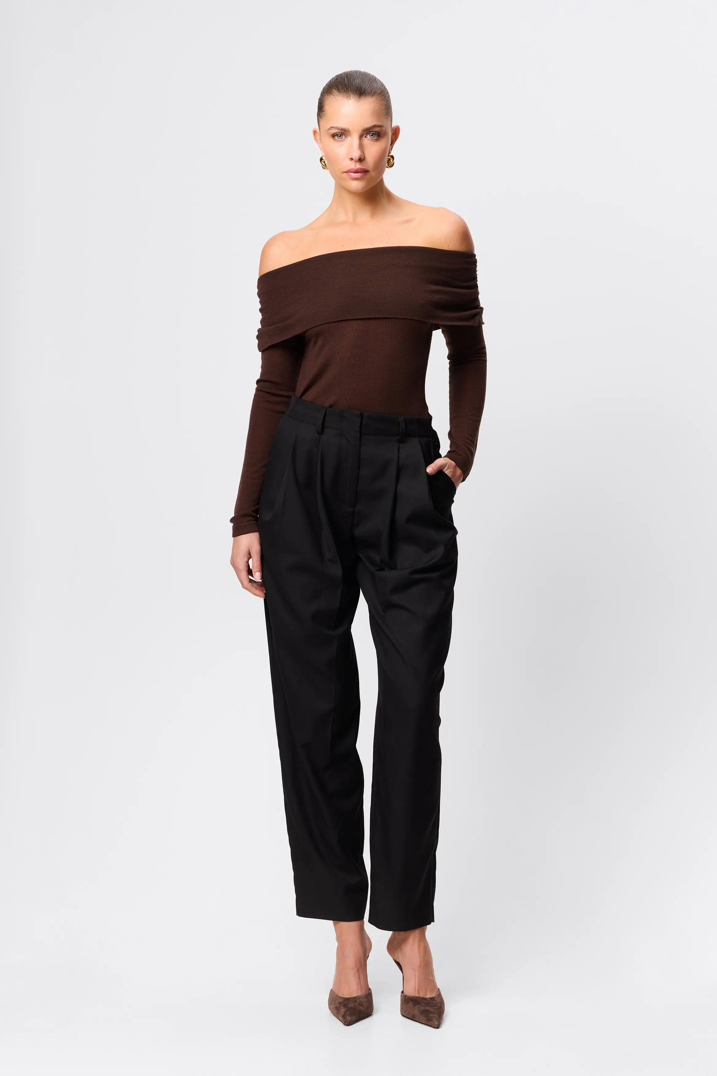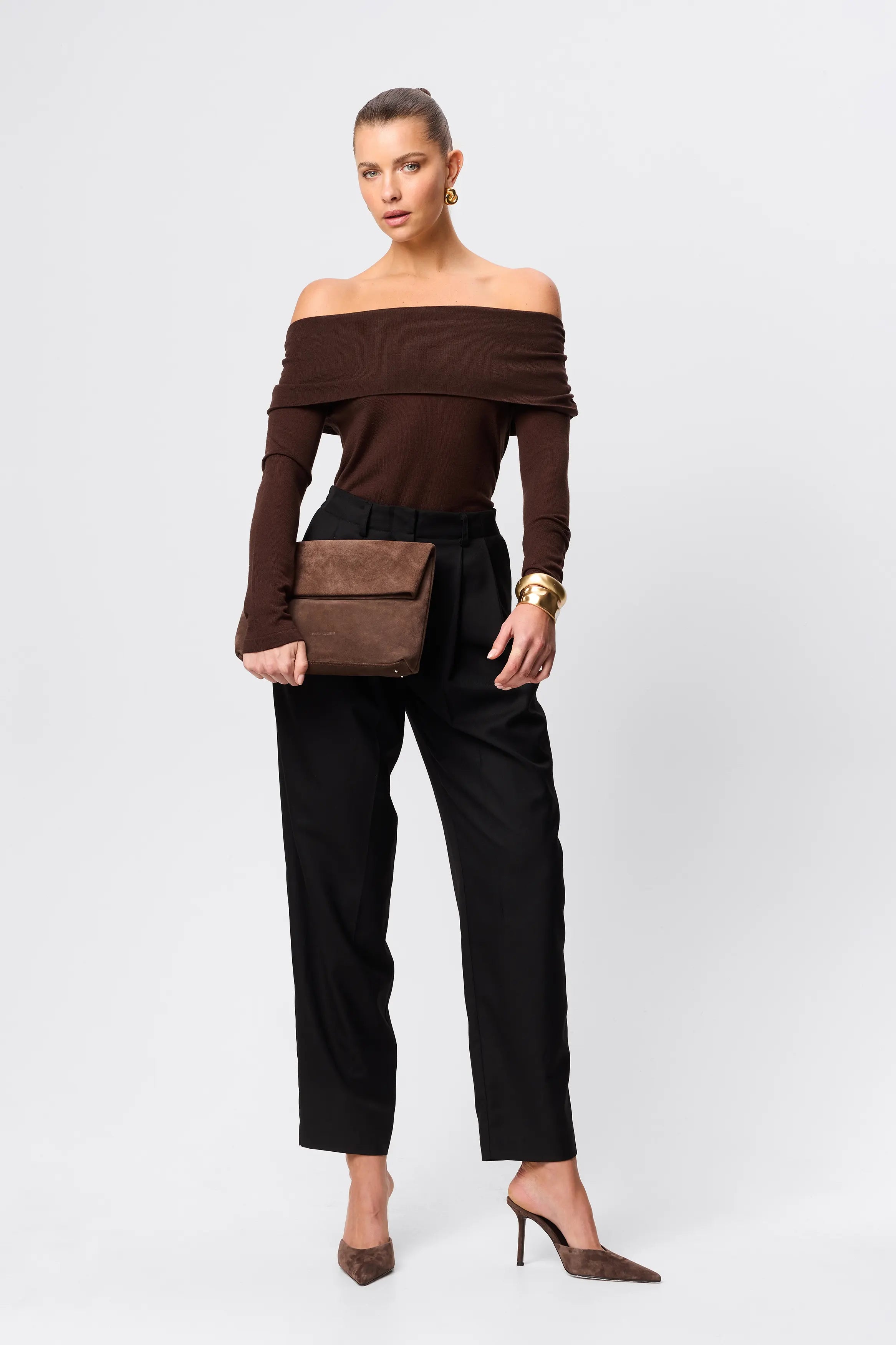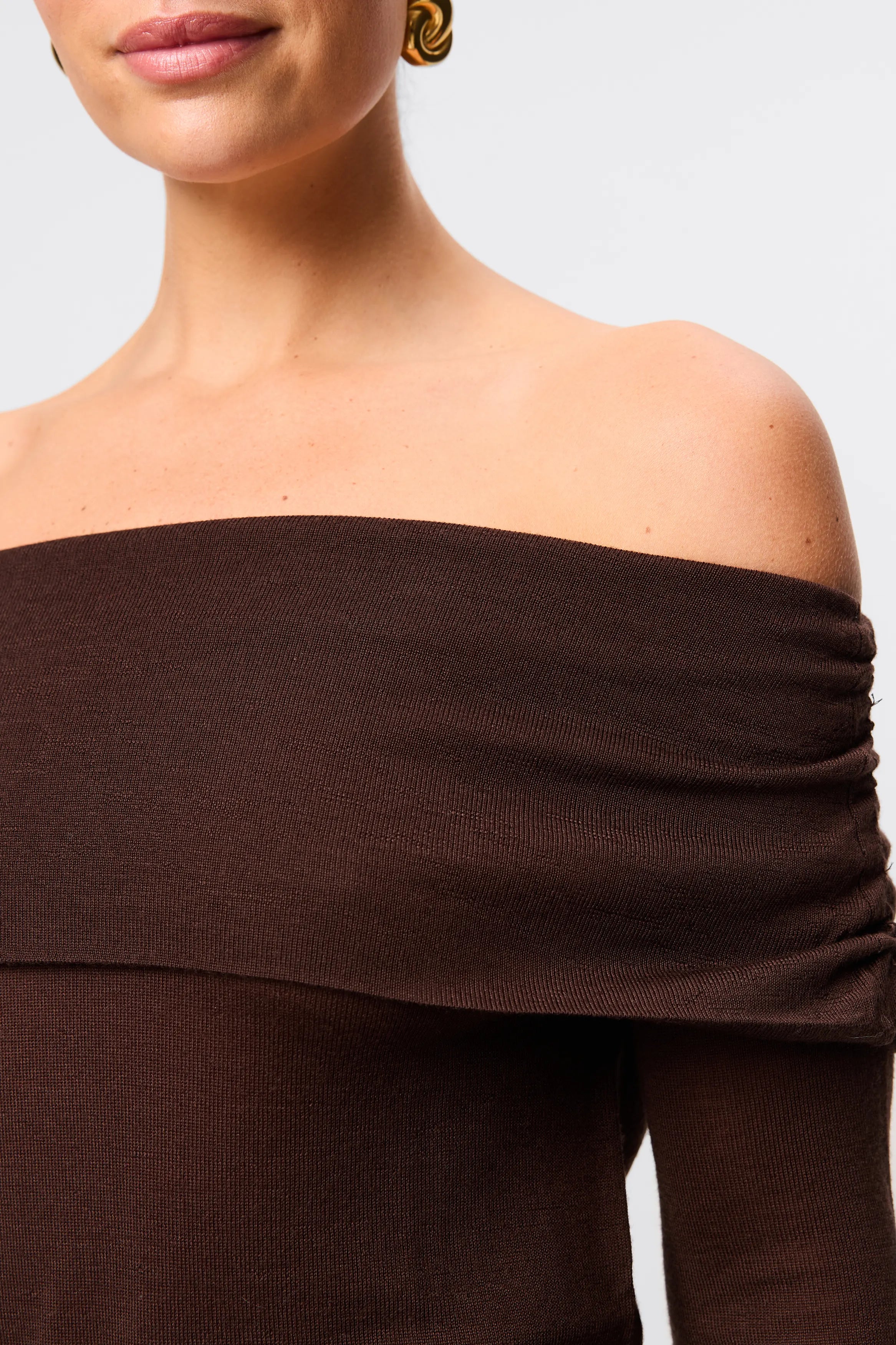 The Maine Off-Shoulder Top in Chocolate is crafted from 100% pure merino wool, striking the perfect balance between warmth and elegance. Designed for a sleek, form-fitting silhouette, it features a bardot neckline, double-layered fold-over bust detail, and long sleeves. A versatile knitwear staple, it can be layered or worn on its own, effortlessly pairing with denim for a refined day-to-night look.