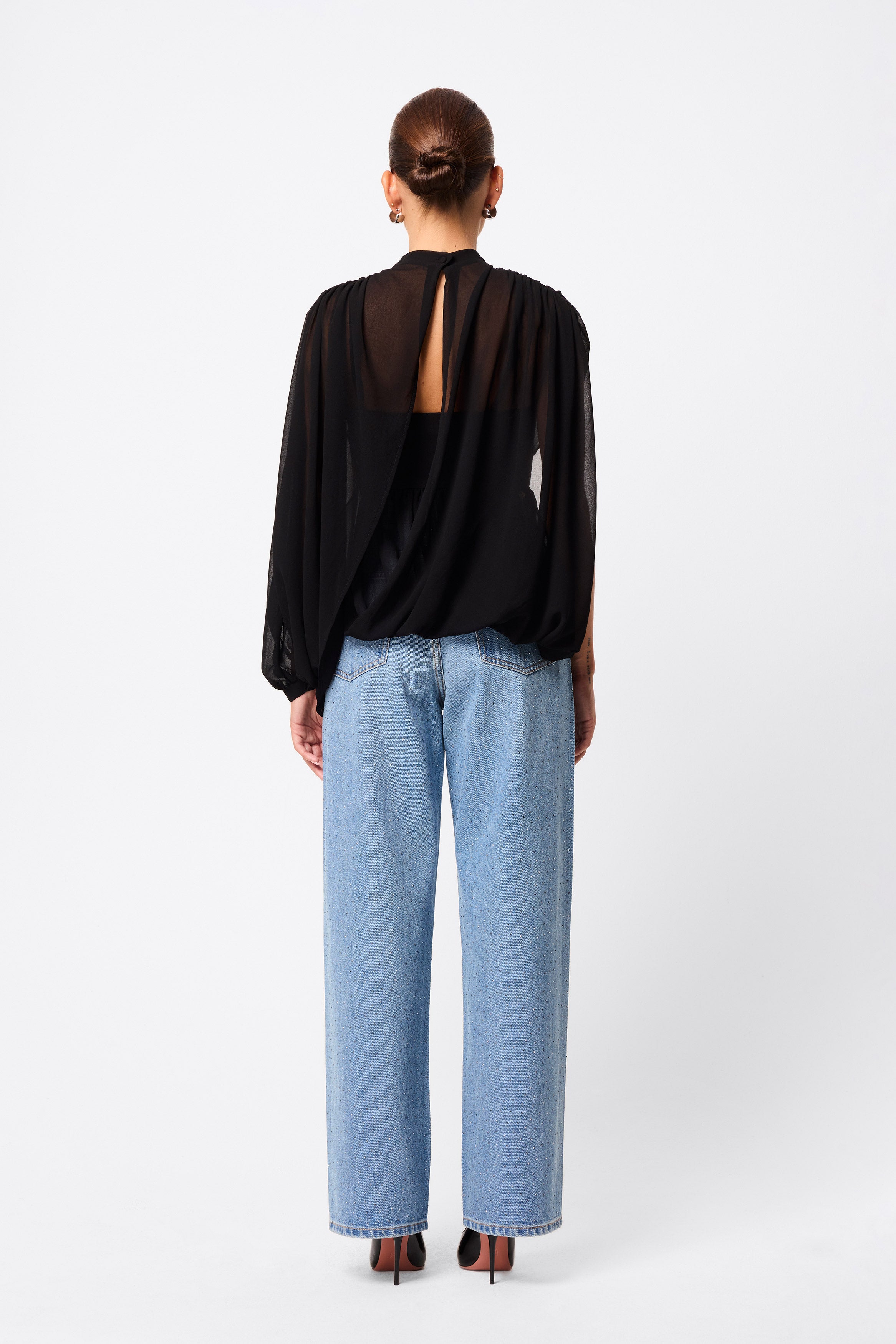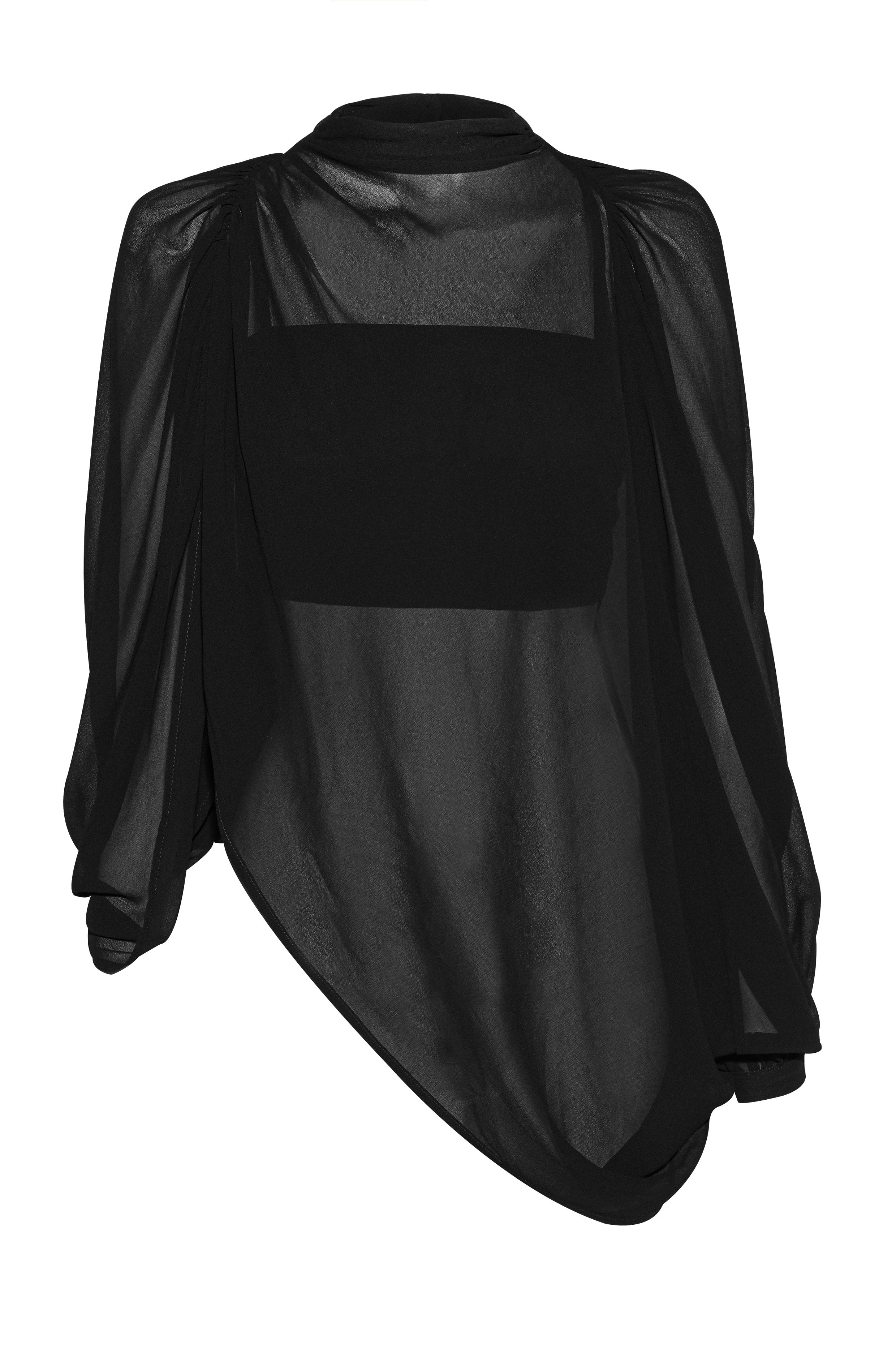 The Make Your Move Top in Black is a statement piece that combines fluid draping with modern refinement. Crafted in a sheer fabrication, this asymmetric design features a single full sleeve with gathered shoulders and a buttoned cuff for subtle structure. Designed in an off-body silhouette, it drapes and falls effortlessly, creating a light, ethereal aesthetic. A high neckline with a back button closure adds polish, while the attached camisole with adjustable straps ensures coverage and comfort. Contemporary and versatile, this piece pairs seamlessly with tailored separates or denim for an elevated day-to-night look.