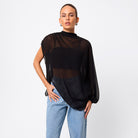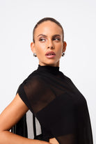 The Make Your Move Top in Black is a statement piece that combines fluid draping with modern refinement. Crafted in a sheer fabrication, this asymmetric design features a single full sleeve with gathered shoulders and a buttoned cuff for subtle structure. Designed in an off-body silhouette, it drapes and falls effortlessly, creating a light, ethereal aesthetic. A high neckline with a back button closure adds polish, while the attached camisole with adjustable straps ensures coverage and comfort. Contemporary and versatile, this piece pairs seamlessly with tailored separates or denim for an elevated day-to-night look.