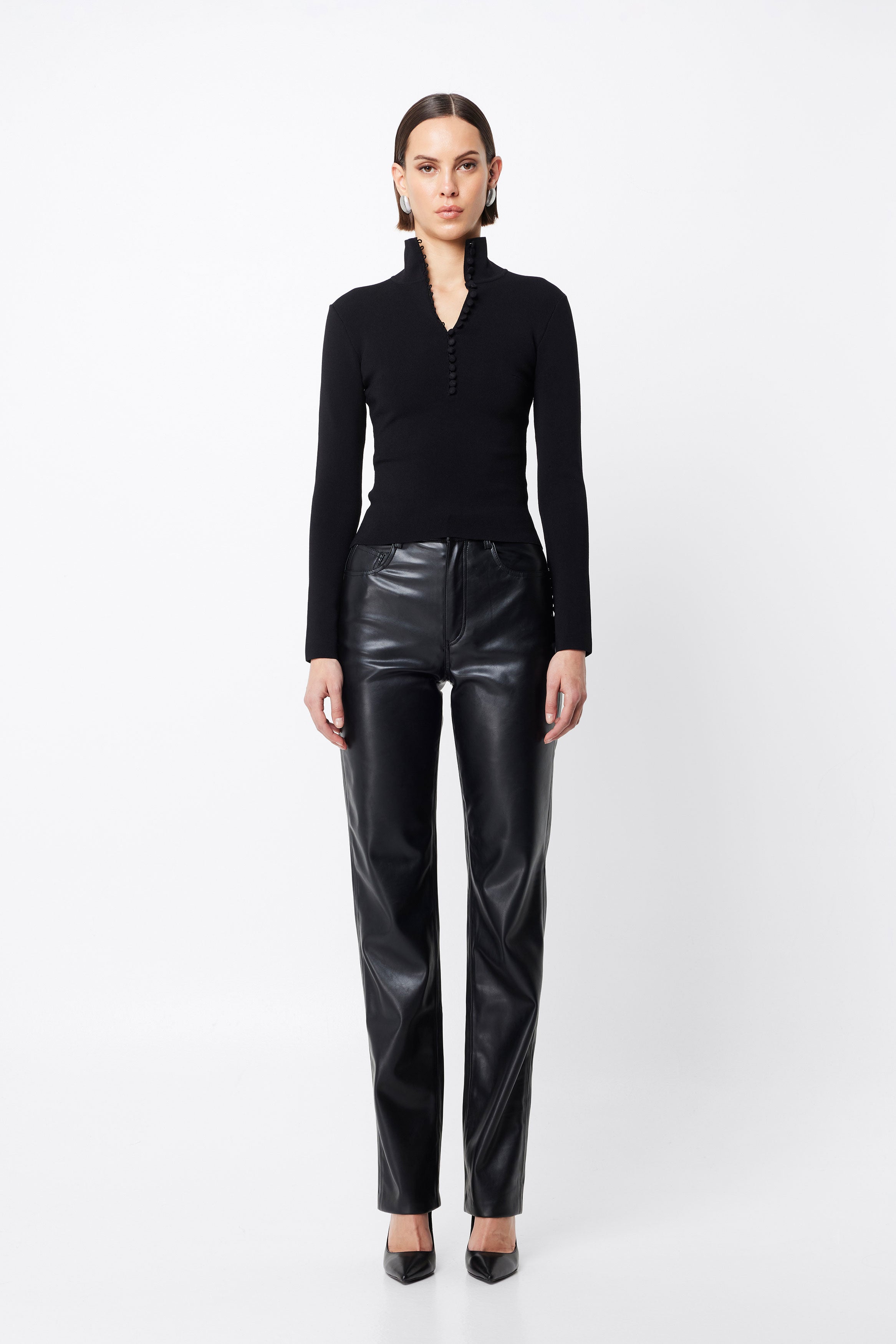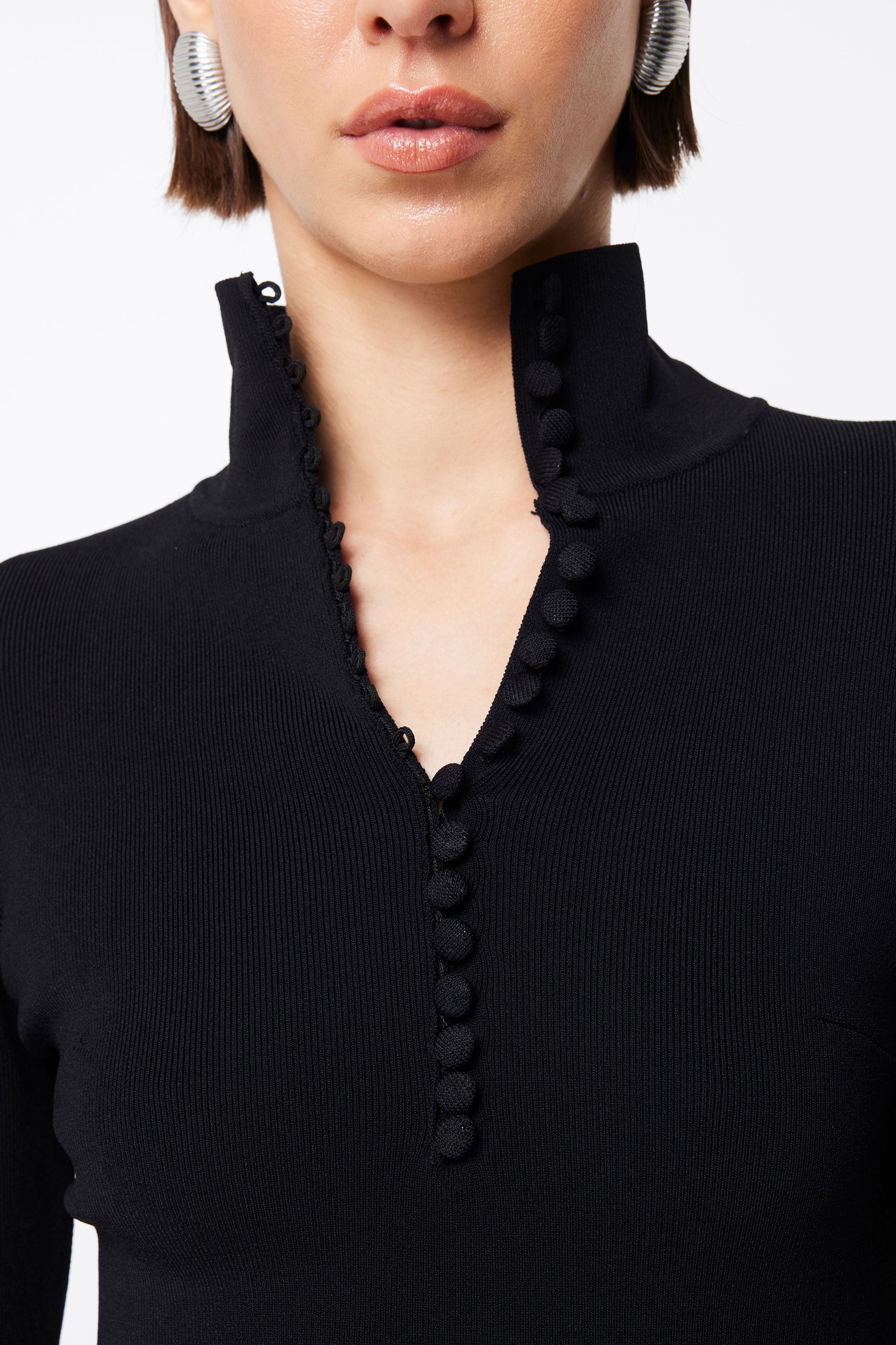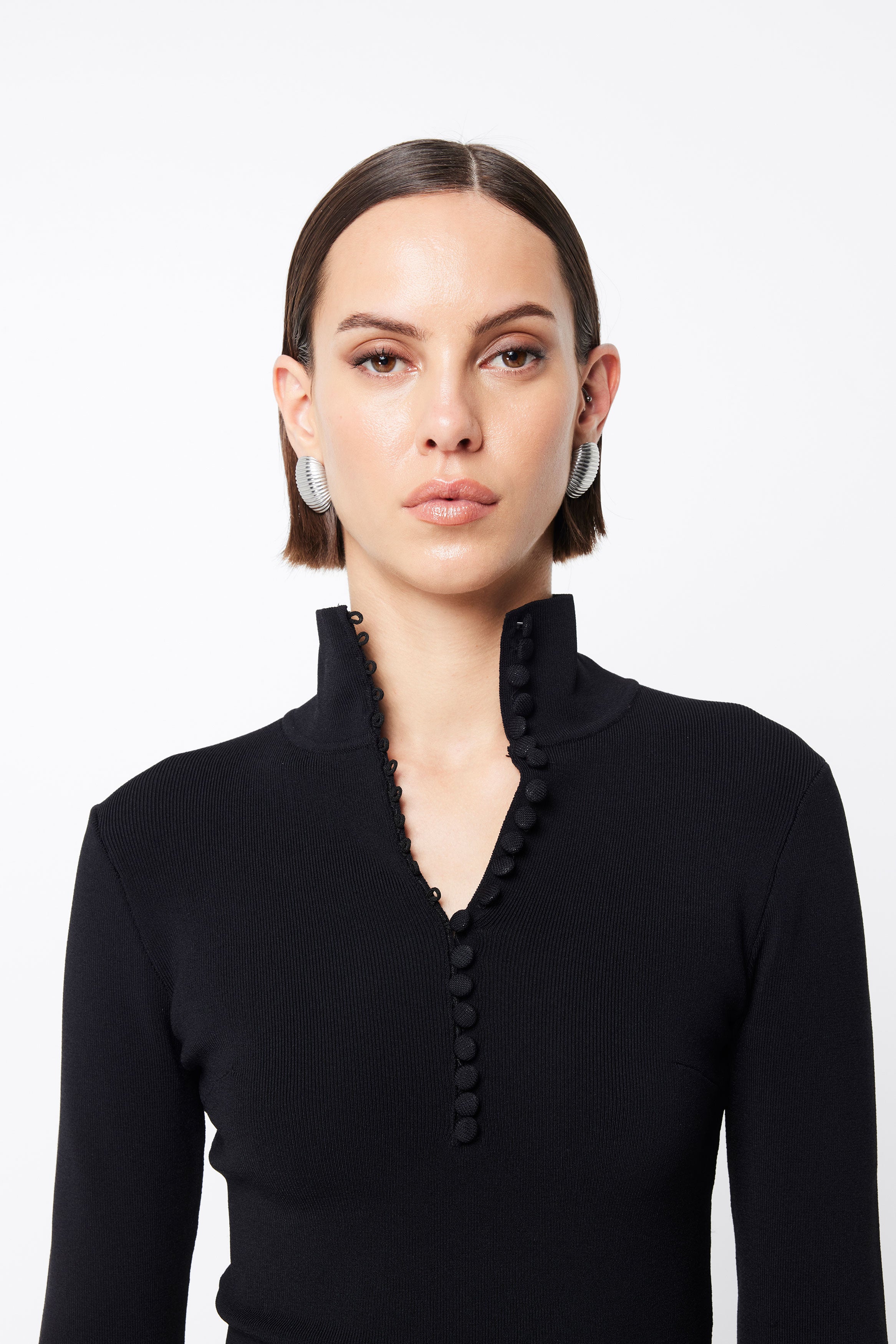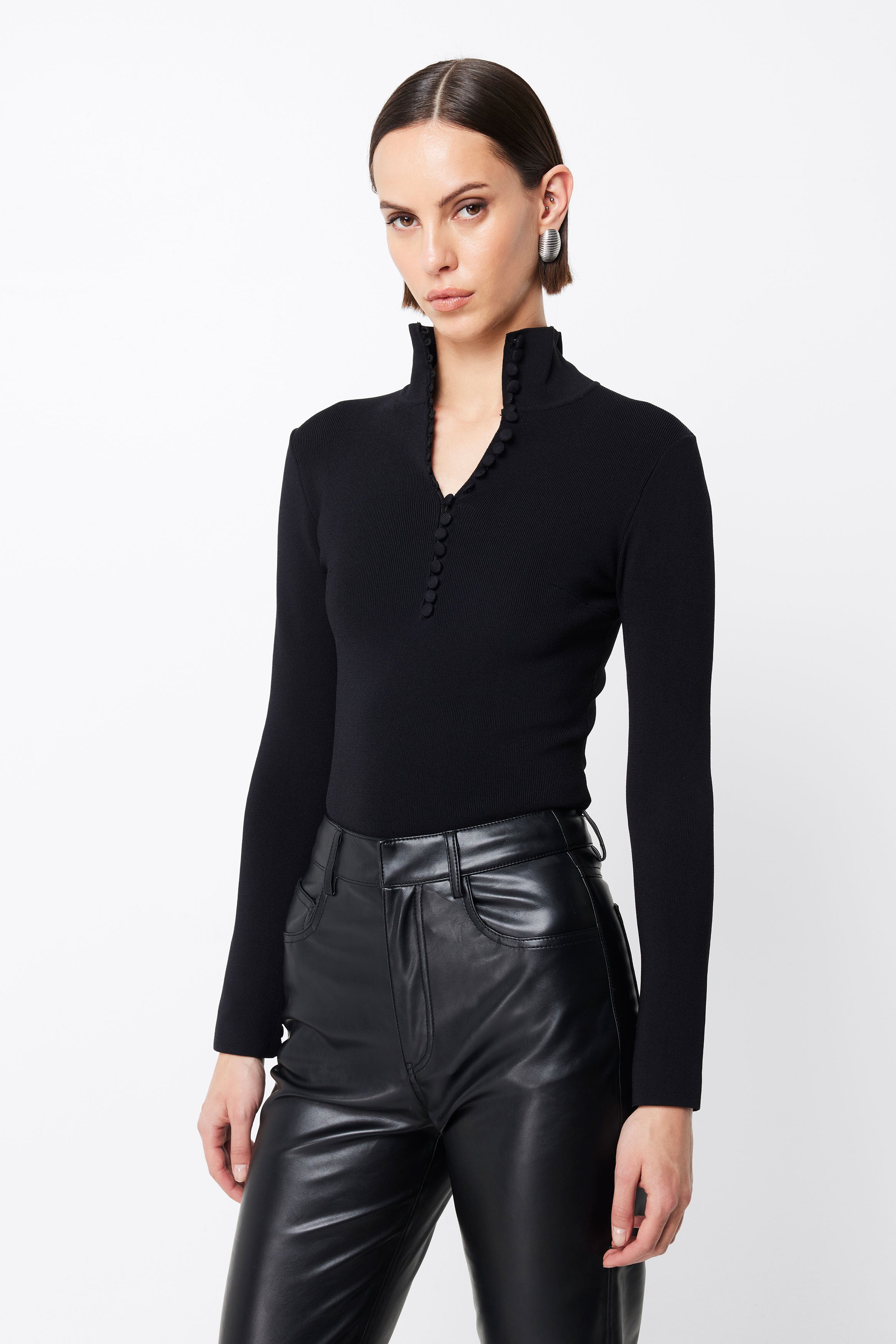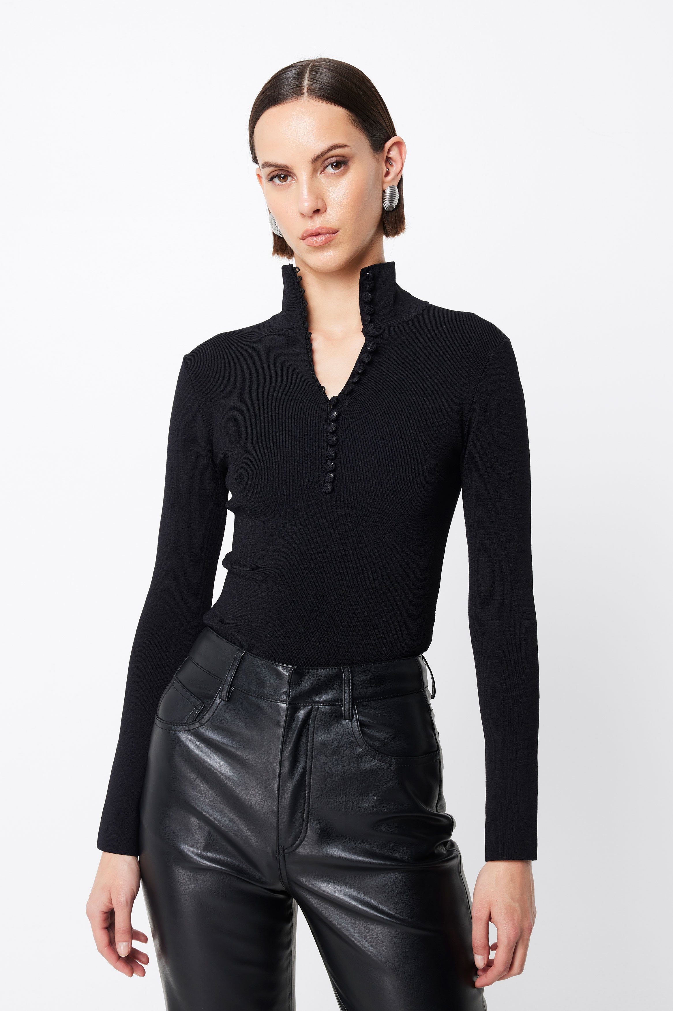 A perfect blend of comfort and style. The Mayfair Long Sleeve Top in Black features a unique detail with buttons running along the V-neckline, adding a touch of sophistication. The same button detail is mirrored on the sleeve cuffs, creating a cohesive and chic look.