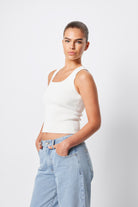 Crafted from high-quality crepe knit fabric, the Monaco Tank Top in White offers elegance and versatility. Featuring a square neckline, and bra-friendly straps, it creates a flattering silhouette that effortlessly transitions from laid-back occasions to more refined events.