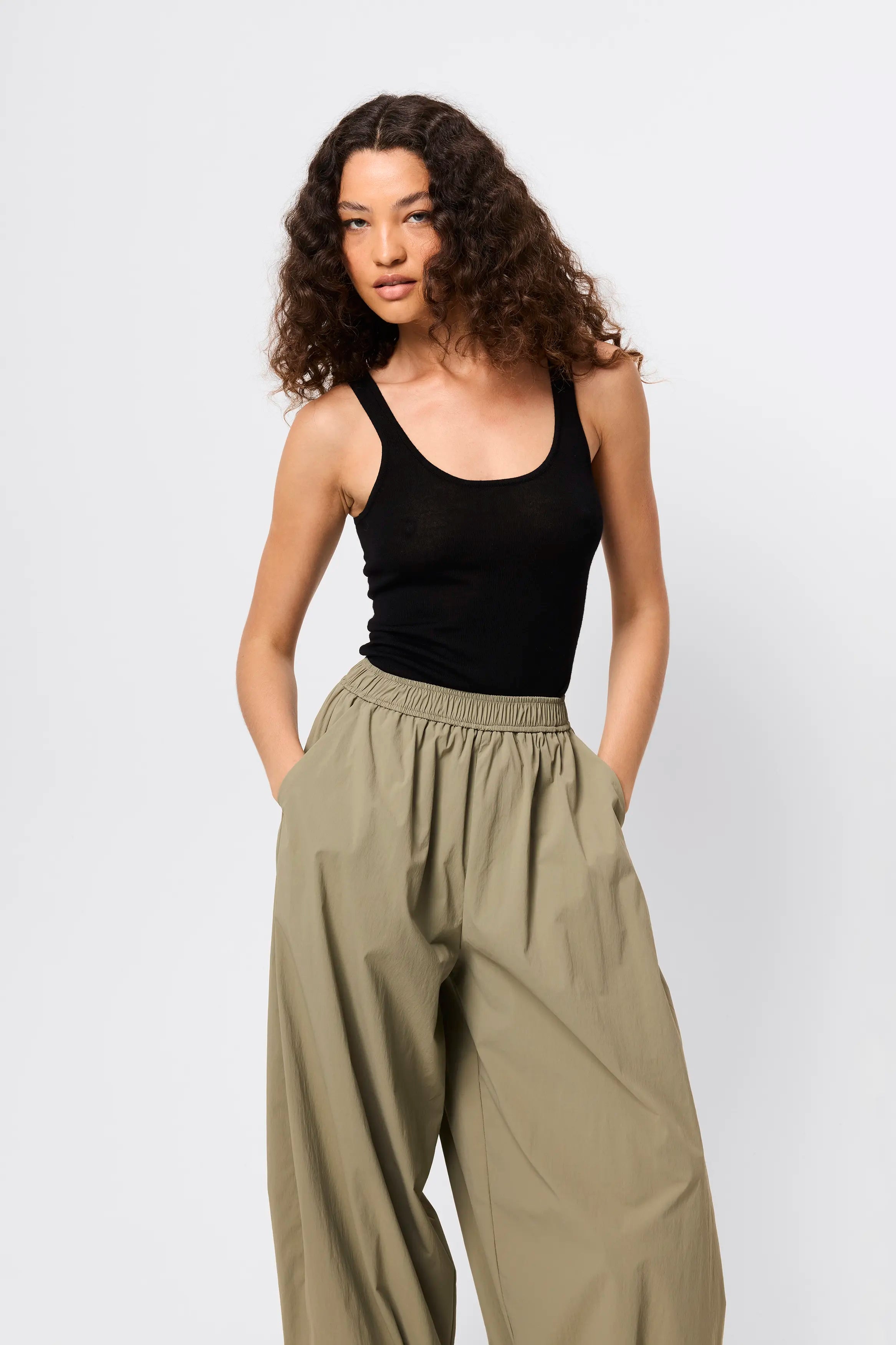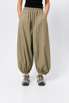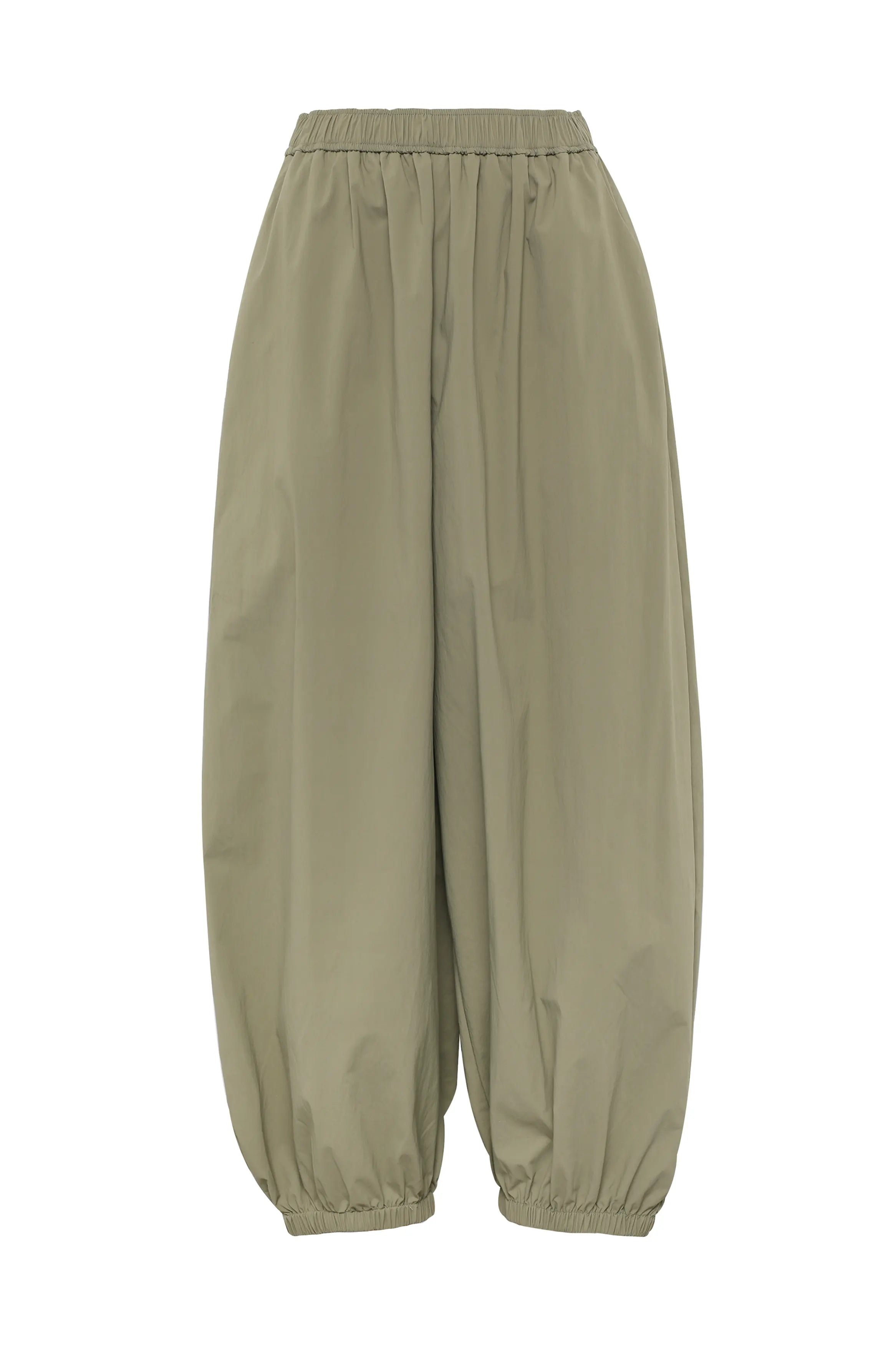 The Overturn Pant in Fern is a modern study in volume, movement and ease. Cut from a lightweight technical fabrication, this silhouette features a relaxed, balloon fit leg with soft gathering through the waist and cuffs to create a sculptural yet wearable shape. Designed to sit comfortably on the body, the elasticated waistband offers effortless pull-on wear while maintaining a refined finish. Twin side pockets further elevate the functionality; when worn with the Overturn Jacket or styled back with elevated separates, this pant delivers a confident balance of functionality and modernity.
