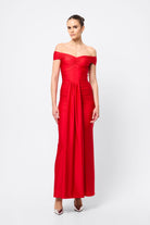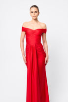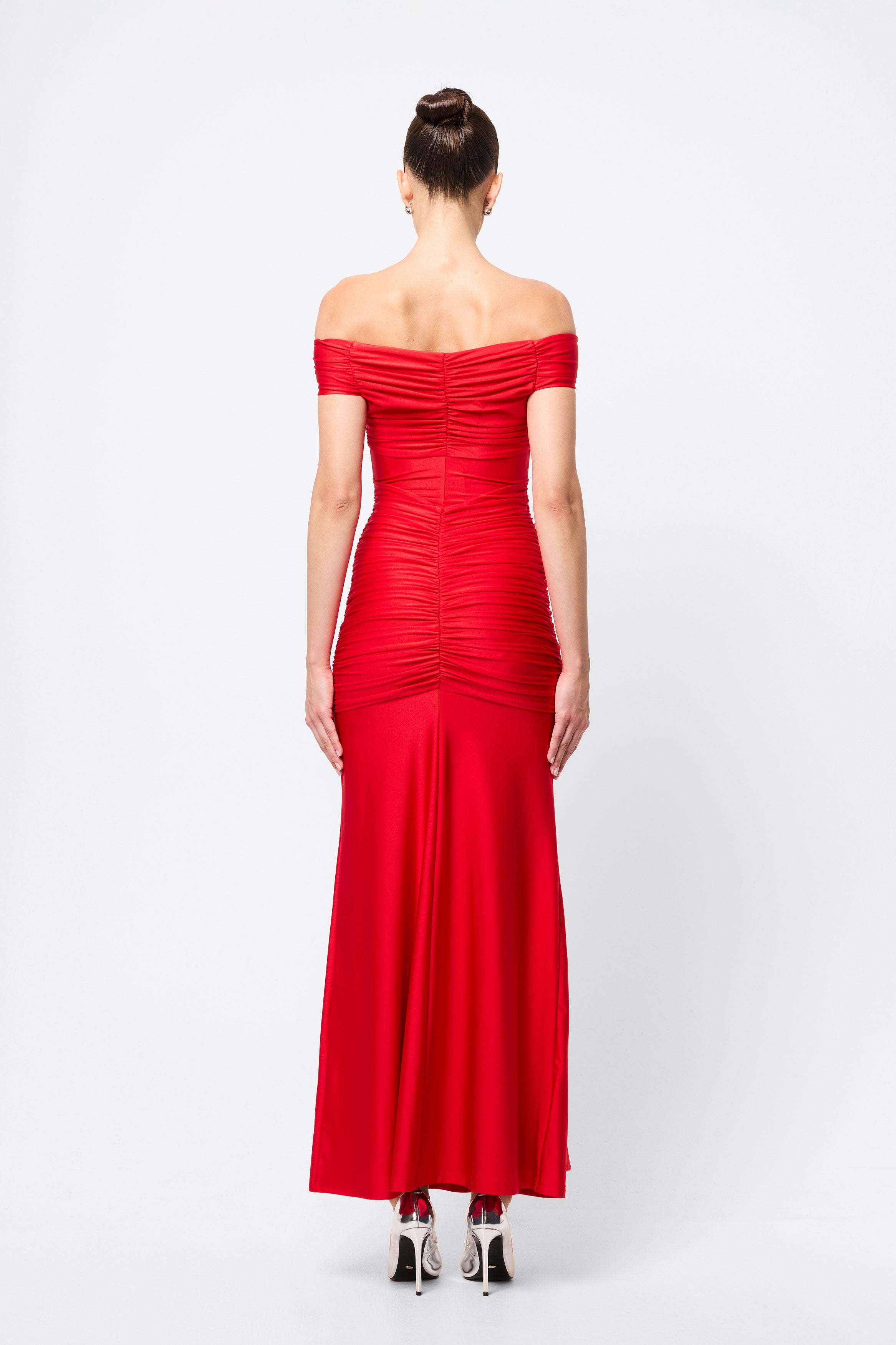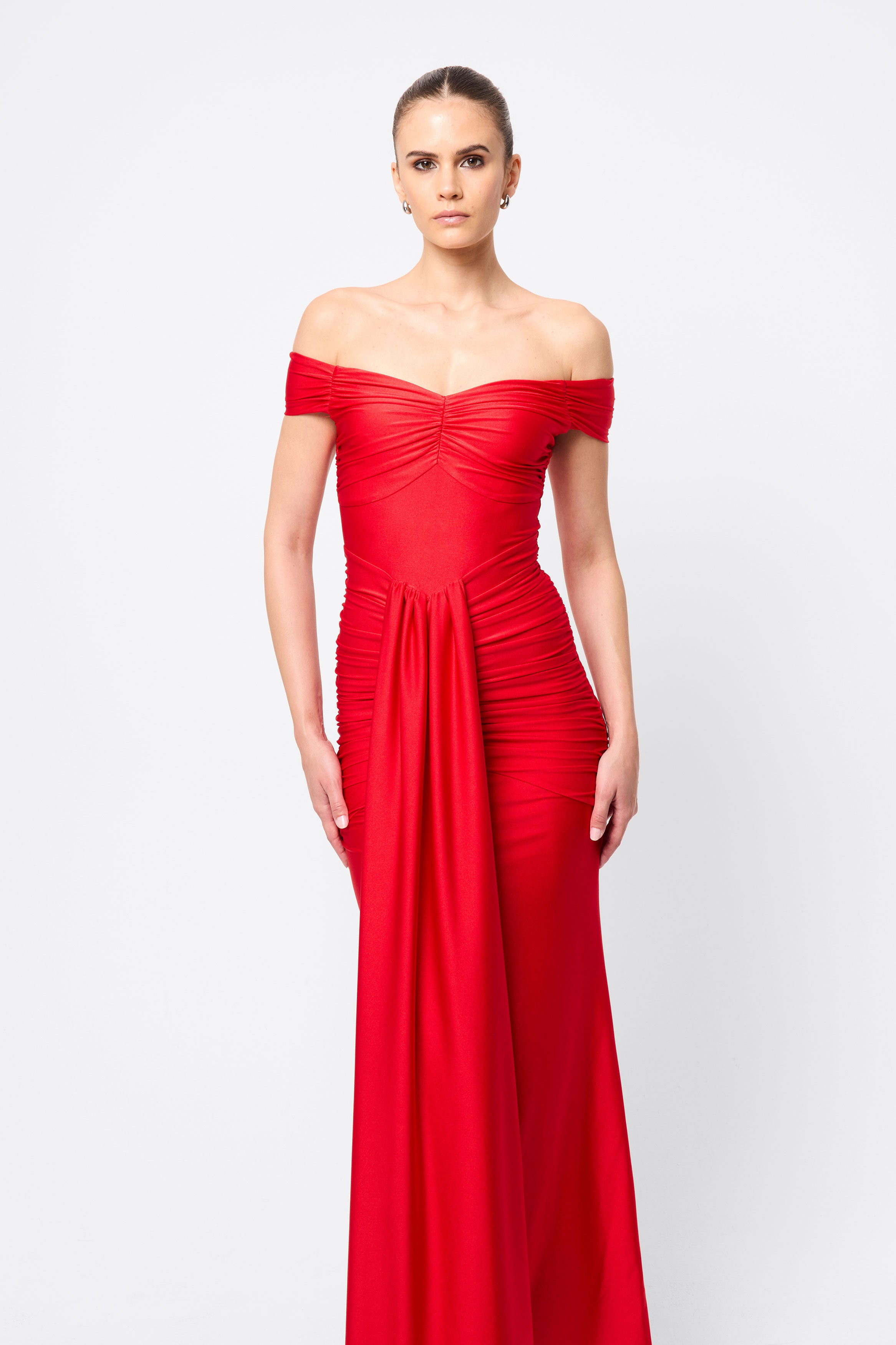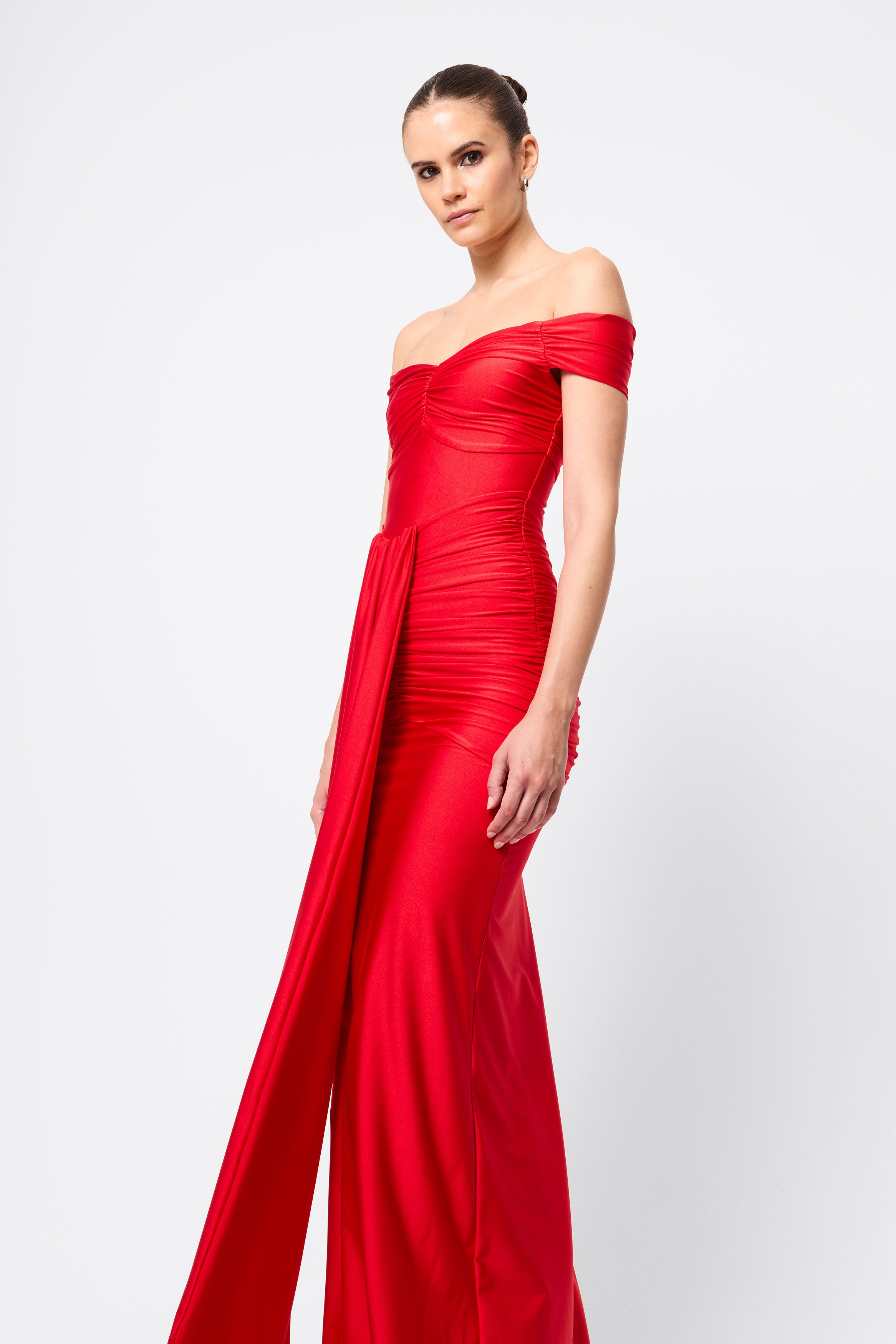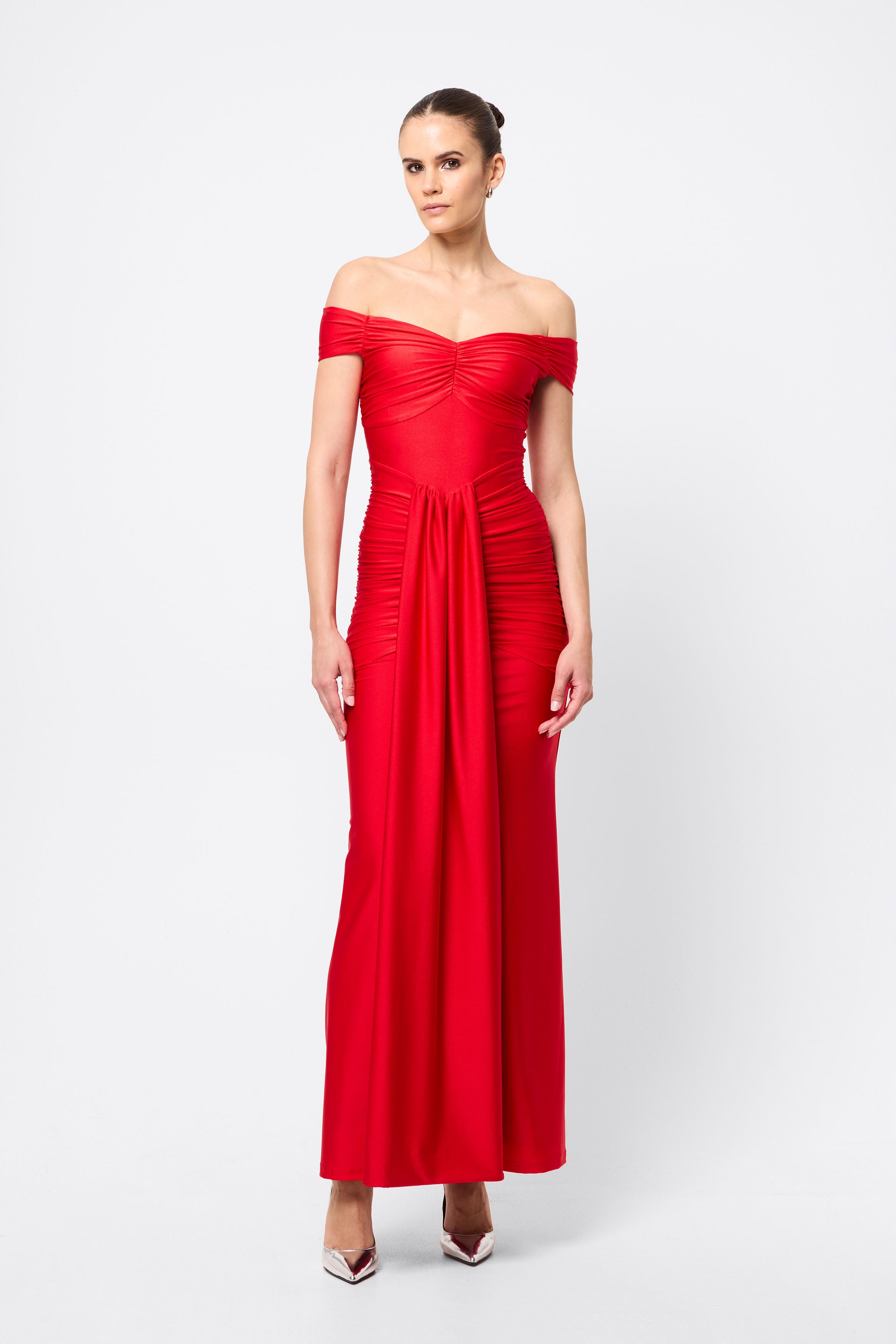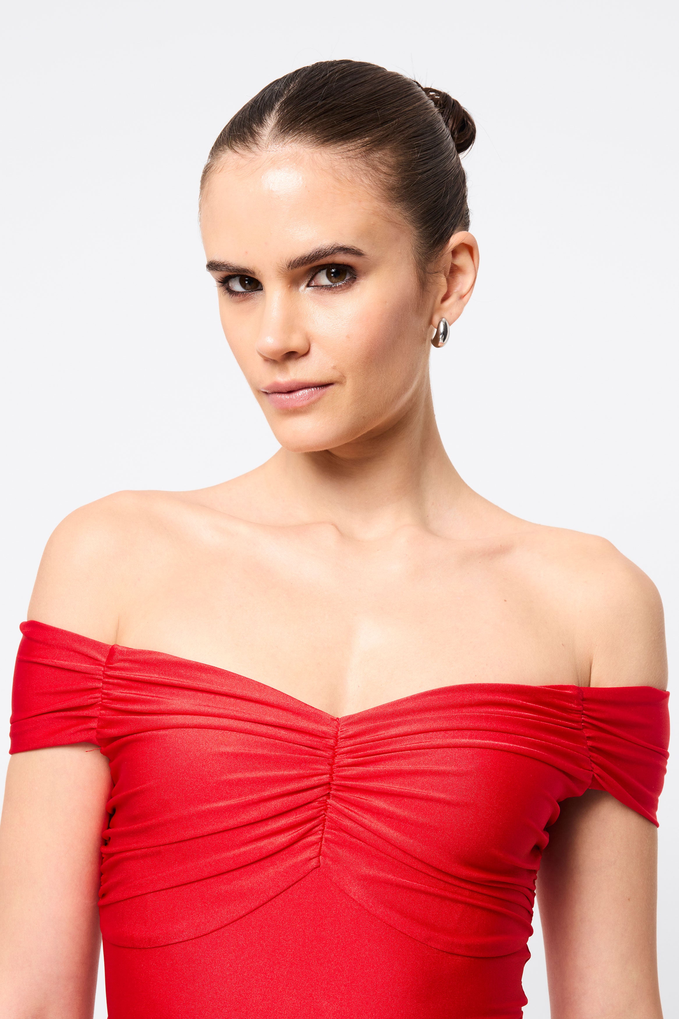 Make a statement in the Presumptuous Off Shoulder Dress in Red. Crafted from a soft Lycra fabrication, this form-fitting silhouette features ruching at the bust and hip for a flattering finish. The off-shoulder neckline frames every shape while the overlay front panel creates a sense of movement and drama, flowing elegantly to the hem. Designed to turn heads, this event-ready style is equal parts bold and refined.