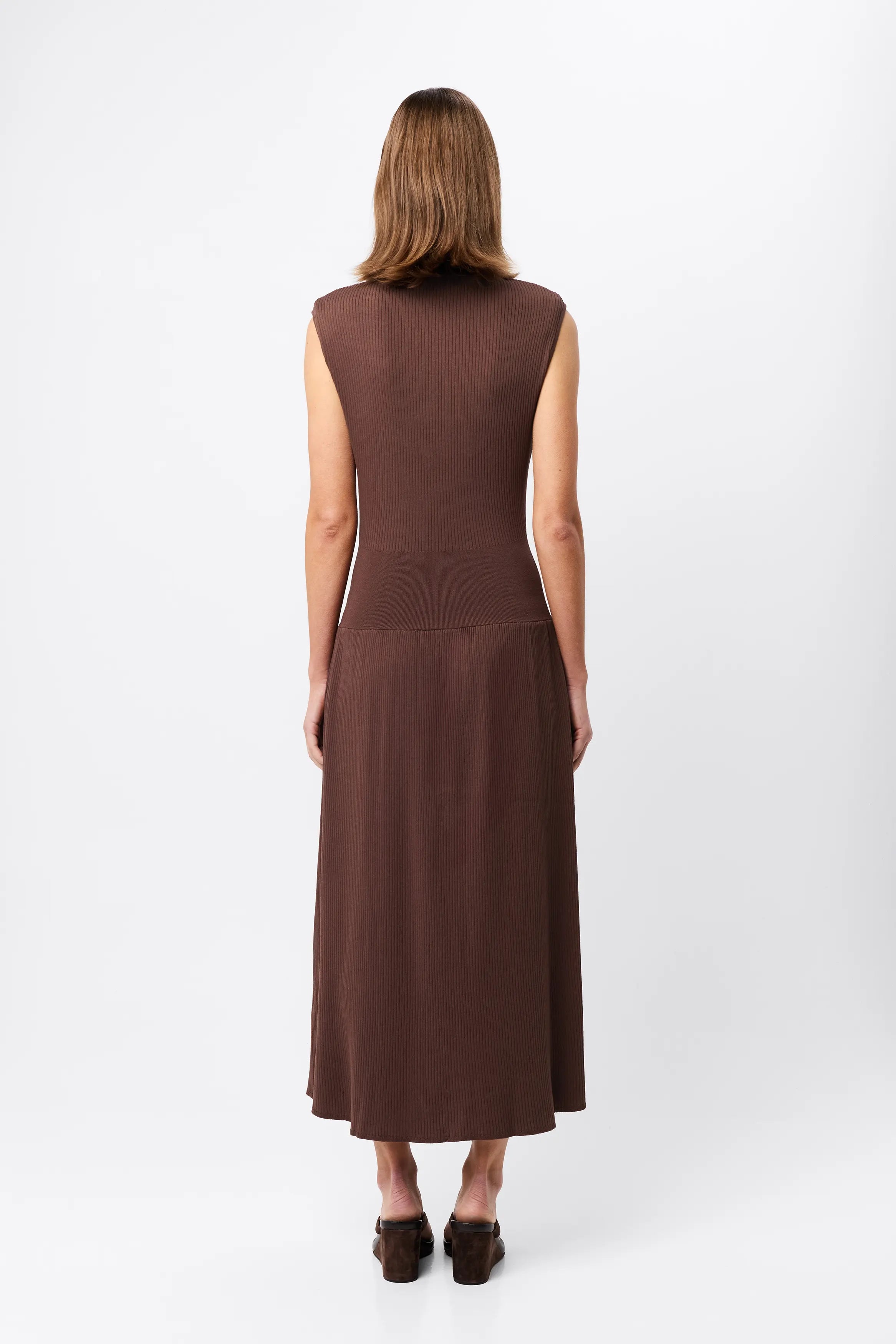 A refined balance of structure and softness. The Quiet Force Midi Dress in Cacao is crafted from a premium ribbed knit fabrication that sculpts the body through the torso before falling into a softly flared skirt. Featuring a turtleneck, sleeveless silhouette, and removable shoulder pads, this design offers a sleek, modern shape with subtle edge. The fitted ribbed waist adds gentle definition, creating an effortlessly elegant profile for day-to-night wear.