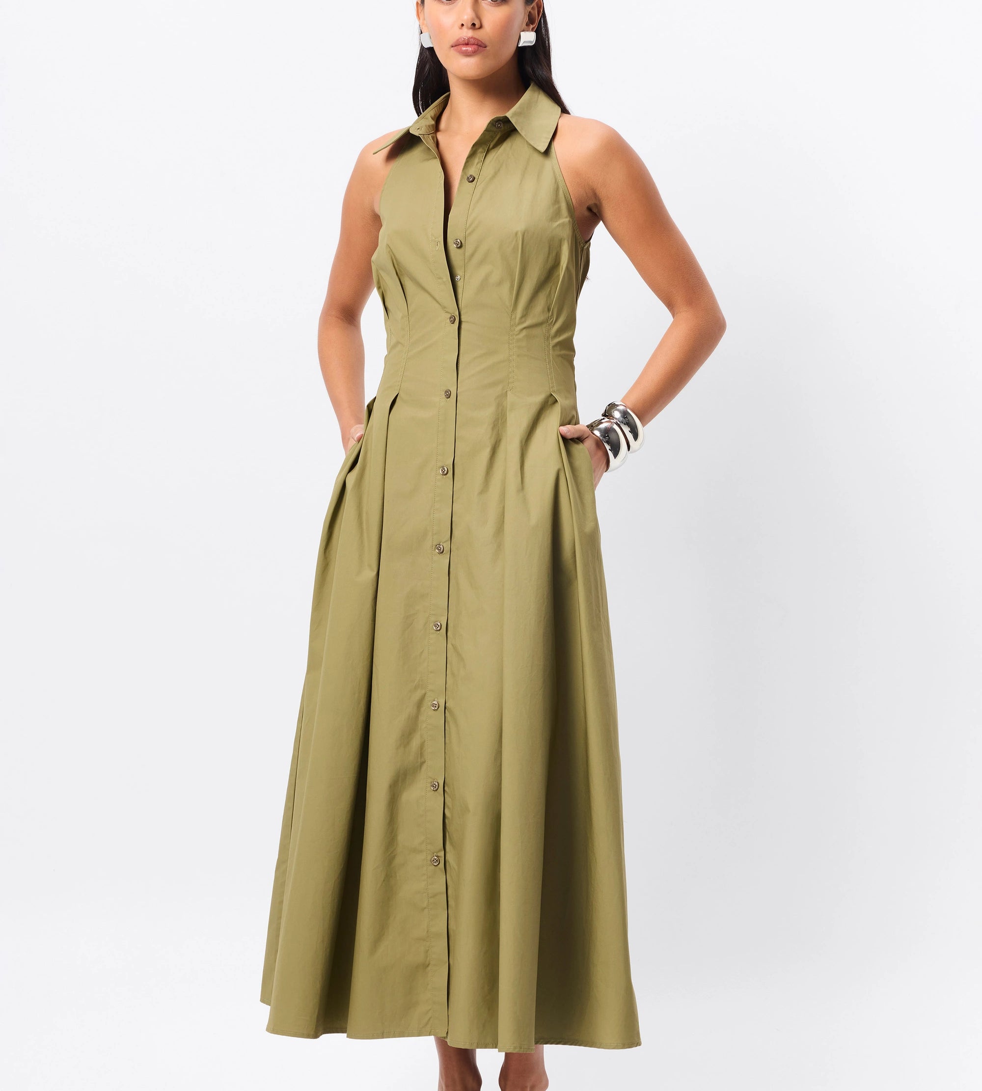 A refined interpretation of the classic shirt dress, the Roam Mini Dress in White embodies effortless sophistication. Crafted from premium 100% cotton, this piece features a structured collared neckline, racerback detail, and a fitted bodice that flows into a semi-flared mini skirt. The stitch detailing at the fixed waist enhances the silhouette, while functional side pockets add a touch of practicality. Designed for the modern minimalist, this dress offers a timeless appeal that transitions seamlessly from day to evening. Keep accessories pared back to maintain its understated elegance.