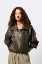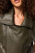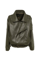 The Saxon Oversized Bomber jacket in Olive is a bold outerwear essential, crafted from premium textured faux leather. Designed with an oversized silhouette, it features a front zip closure with a snap-button flap, a structured double collar with stand detail, and snap-button epaulettes for a utilitarian finish. Dropped shoulders, and adjustable snap-button cuffs enhance the relaxed feel, while an elasticated waistband creates subtle shape. Finished with two front welt pockets and an internal patch pocket, this jacket pairs effortlessly with denim or tailoring for elevated everyday style.