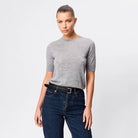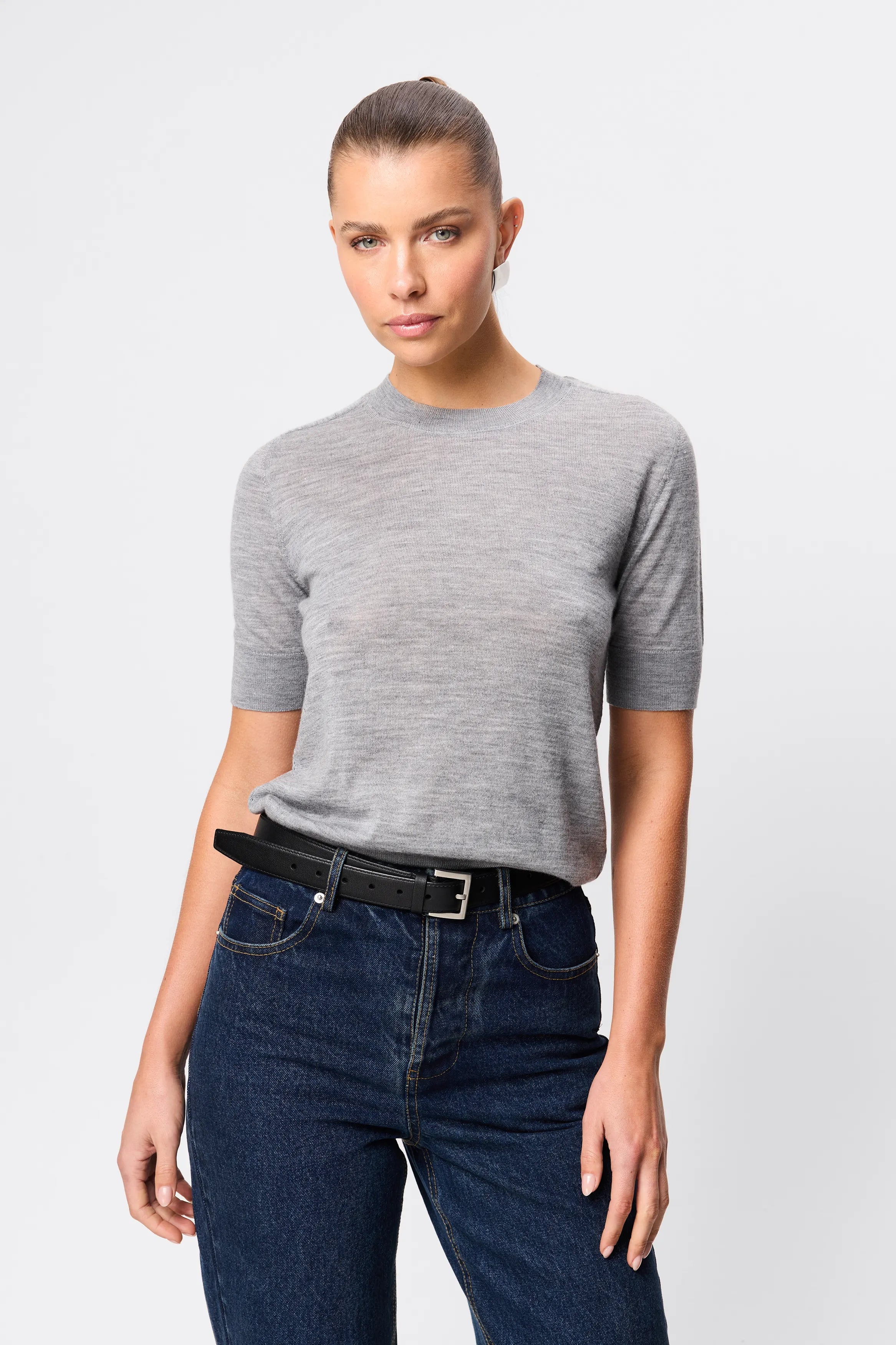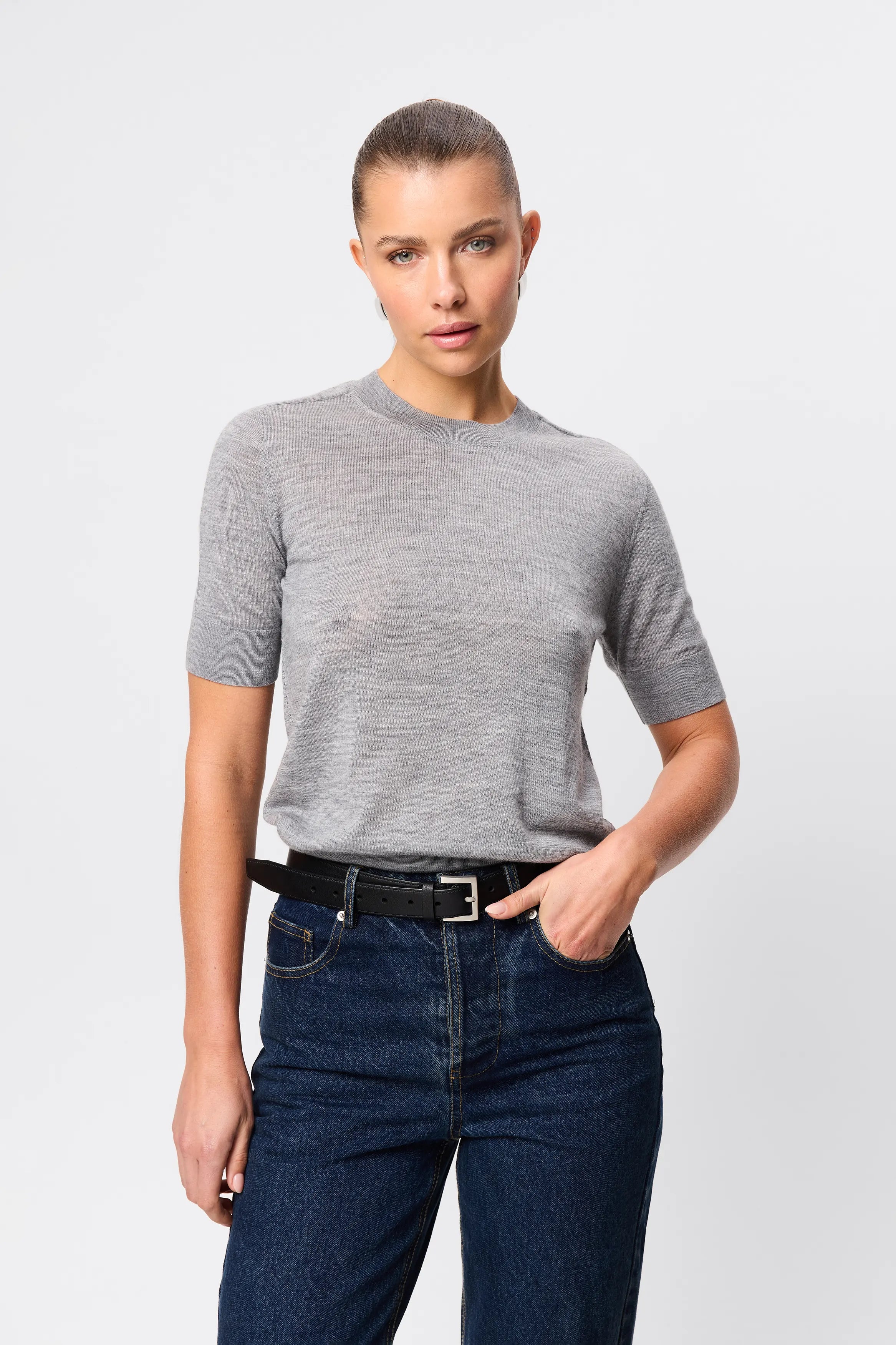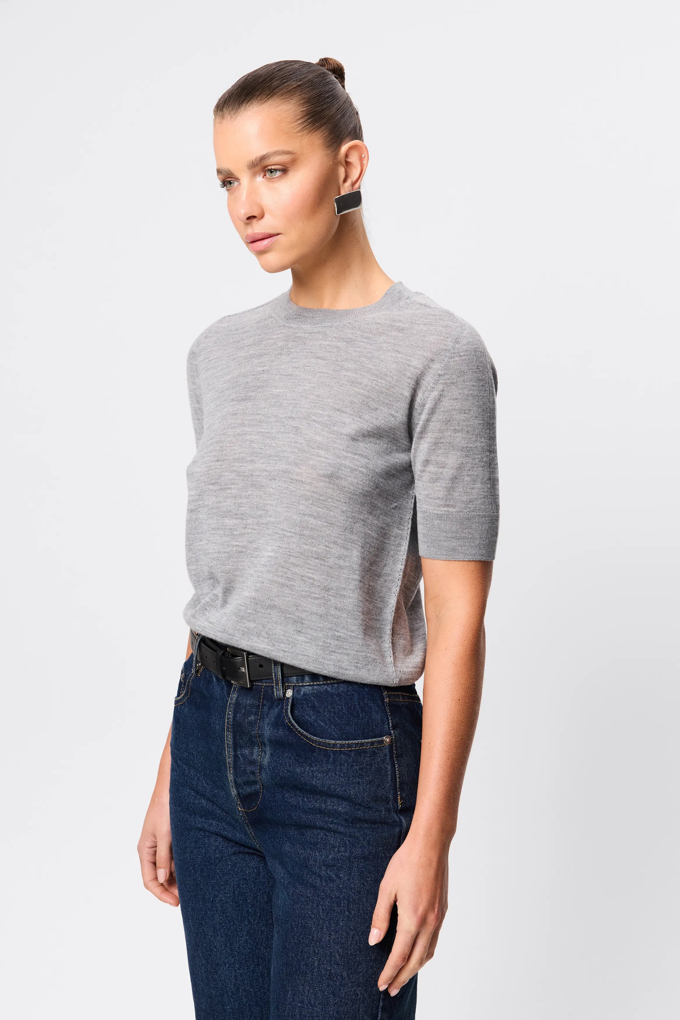 The Sloane Tee in Greymarle redefines everyday dressing with understated sophistication. Crafted from premium 100% Merino wool, this piece offers a soft, breathable feel with a body-skimming silhouette. Designed with a classic crew neckline and short sleeves finished with ribbed trims, it delivers both comfort and refinement. Perfect as a layering piece or a stand-alone statement, the Sloane Tee is a versatile wardrobe essential you’ll return to season after season.