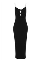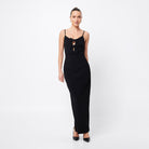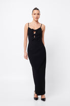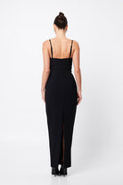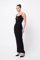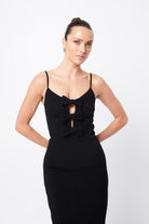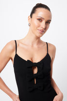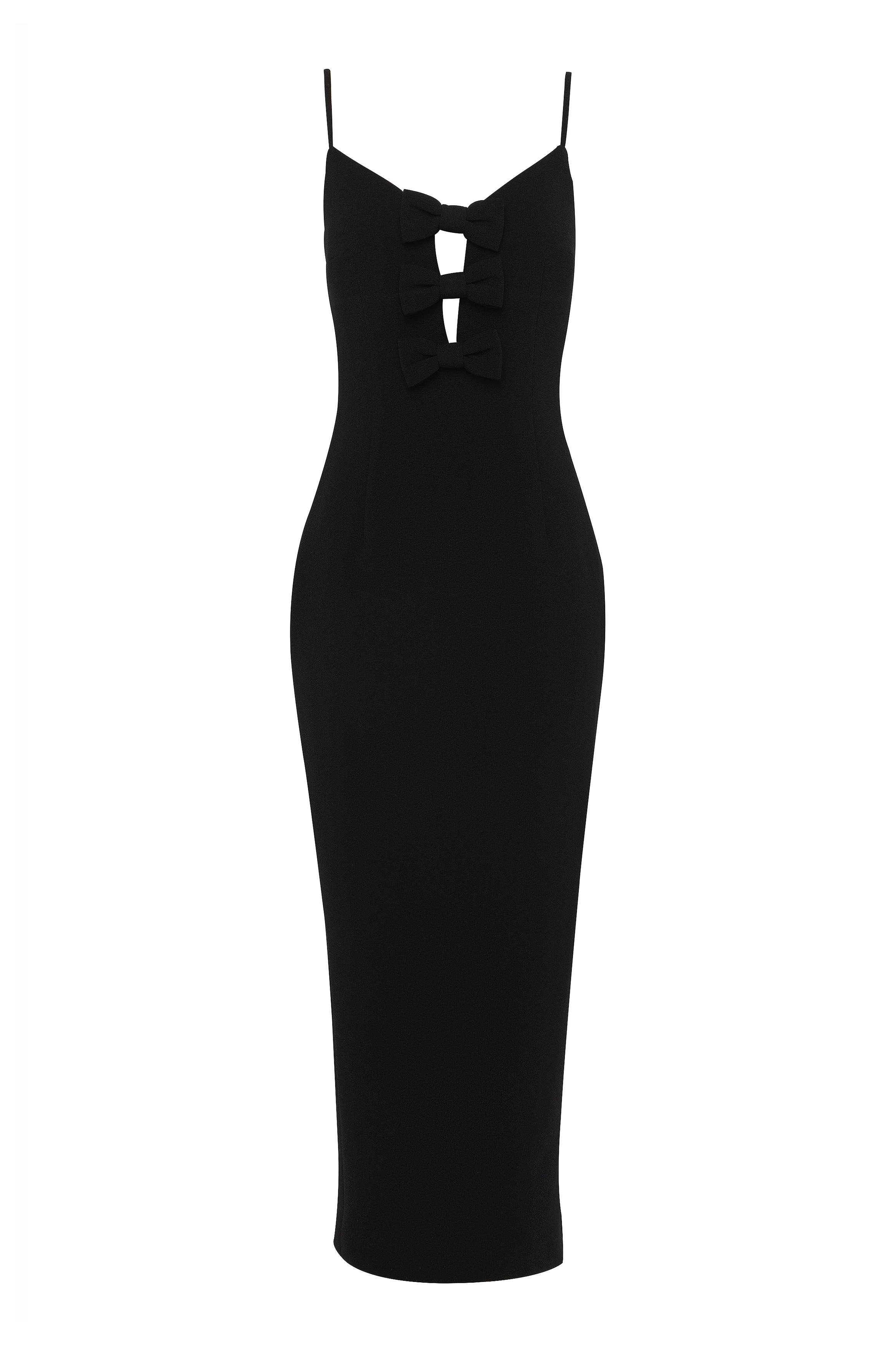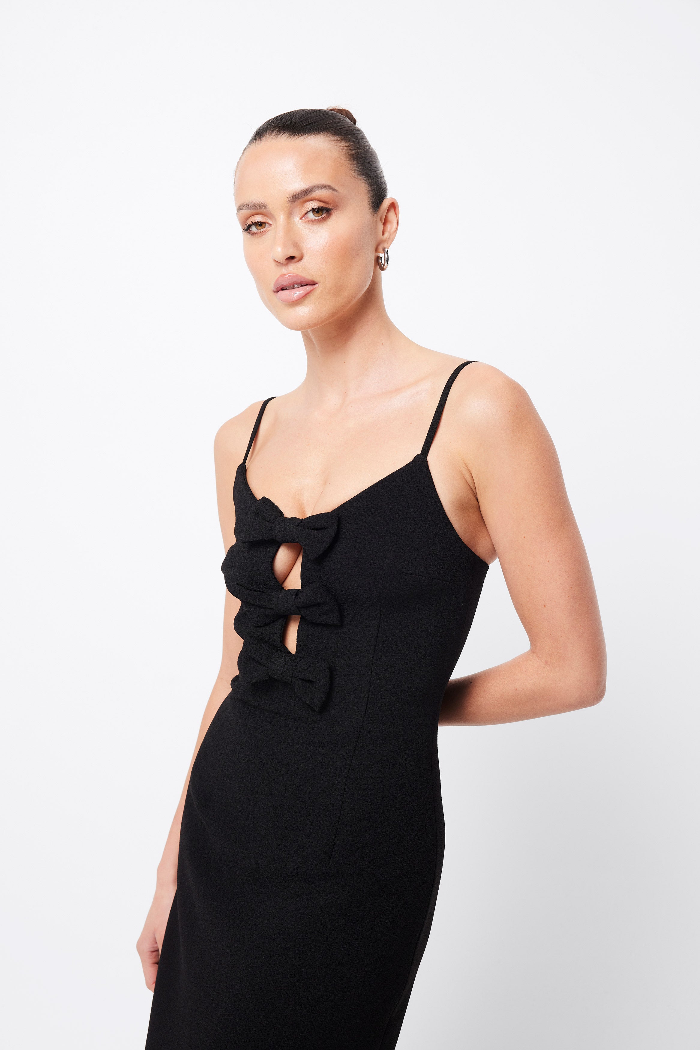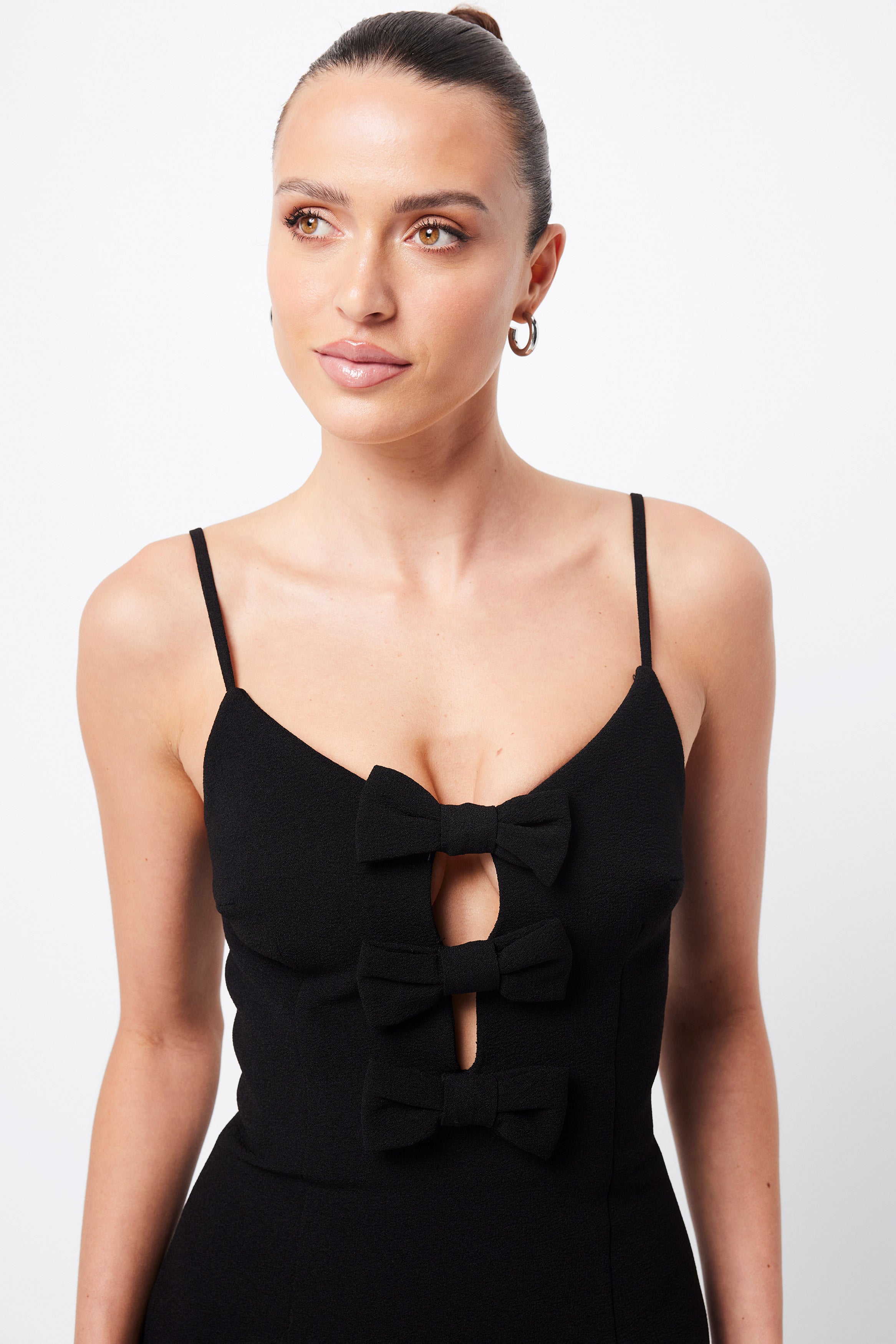 The Tantalise Dress in black blends sophistication with a modern edge. Crafted from fused crepe, it features adjustable shoulder straps, triple bow detailing that enhances the decolletage, and a body-skimming silhouette for a sleek, flattering fit. Pair with minimalist accessories for an effortlessly elegant evening ensemble.